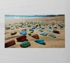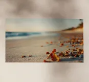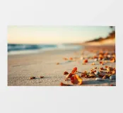 Colorate foglie autunnali si posano sulla riva sabbiosa mentre le dolci onde dell'oceano lambiscono la spiaggia durante un sereno tramonto. L'atmosfera tranquilla esalta la bellezza della natura.