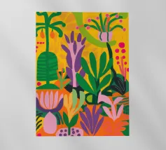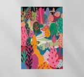 Alberi e cespugli colorati stilizzati riempiono la tela in una fantasia naturalistica astratta e stravagante.