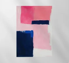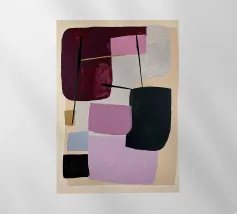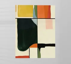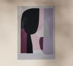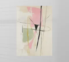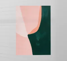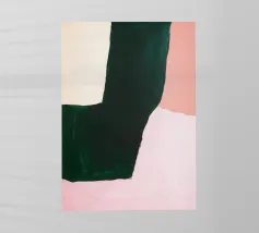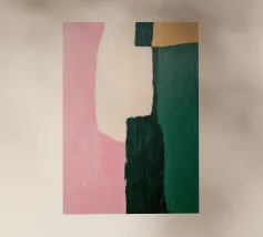Un dipinto minimalista con una tavolozza di colori rosa e verdi, pennellate spesse e forme astratte. Un grande rettangolo nero verticale si trova al centro della composizione, illustrando i principi del minimalismo e l'uso dello spazio negativo. Il dipinto contiene anche tonalità arancioni chiare e rosse scure, che creano un'opera visivamente sorprendente ed equilibrata.