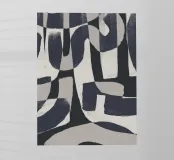 L'immagine è caratterizzata da audaci forme sovrapposte in bianco e nero, che creano un dinamico motivo astratto. I forti contrasti tra luce e buio ne esaltano l'impatto visivo.