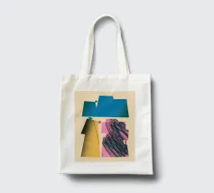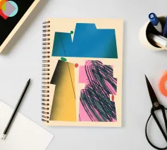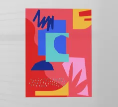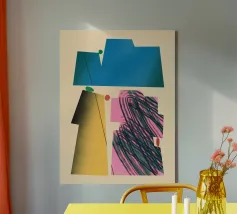 Forme geometriche audaci in blu, giallo e rosa contrastano con uno sfondo neutro. Ombre organiche e punti colorati creano una composizione dinamica e astratta.