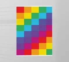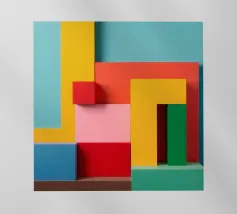Forme geometriche dai colori vivaci sono disposte in un motivo accattivante. La composizione presenta quadrati e rettangoli di vari colori, creando un gioioso impatto visivo.