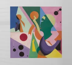 Questo dipinto mostra una composizione astratta con un mix di forme geometriche e organiche. I colori sono decisi e comprendono il nero, il blu, il rosso e il bianco. Le forme si sovrappongono e creano un senso di profondità.