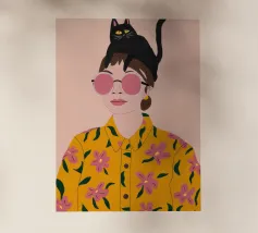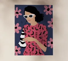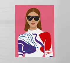 Ritratto di una donna elegante con occhiali da sole, orecchini di perle e camicetta rosa a fiori, che emana sicurezza e modernità.