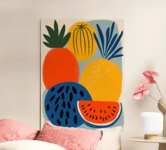 Frutta fresca e colorata da afferrare: Questa vibrante composizione unisce i frutti tropicali in un insieme armonioso. La tavolozza vibrante - arancione brillante, giallo solare, blu profondo e verde lussureggiante - trasmette una voglia di vita mediterranea. Le forme stilizzate oscillano tra astrazione e figurazione: melone, ananas, arancia e frutti esotici sono disposti in uno splendore decorativo. Lo stile pittorico bidimensionale e i motivi grafici mostrano influenze del design scandinavo e dei Papiers découpés di Matisse. Vitamine per gli occhi e puro umorismo estivo per ogni parete.