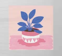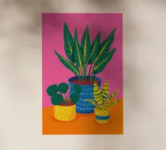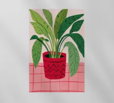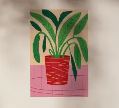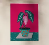 Una pianta di anthurium rosa di grande effetto si trova in un vaso variopinto e decorato su uno sfondo di un vibrante rosa caldo. La composizione è una celebrazione audace ed elegante del colore e delle piante tropicali.