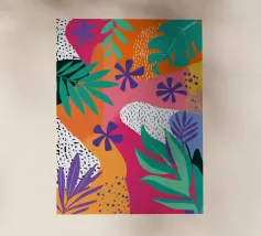 Un motivo audace ed energico che combina la stampa leopardata con fiori e foglie tropicali astratti in una vivace combinazione di colori, creando una fusione selvaggia e alla moda.