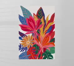 Una composizione astratta che fonde elementi floreali stilizzati con audaci forme geometriche in una vibrante tavolozza di blu, gialli, arancioni e verdi, creando una dichiarazione artistica dinamica e moderna.