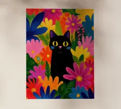 Portate un tocco di giocosa magia nel vostro spazio con questa stravagante illustrazione di gatto nero, ornata da vivaci fiori di ispirazione boho in calde tonalità acquerello. Con il suo fascino incantevole e la tavolozza accogliente, quest'opera d'arte irradia personalità e cuore, rendendola un'aggiunta deliziosa a qualsiasi stanza. Perfetta per gli amanti dei gatti, gli interni boho e le idee regalo uniche, aggiunge un tocco artistico sia all'arte da parete che agli accessori di uso quotidiano.