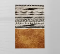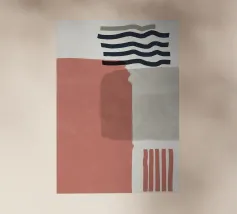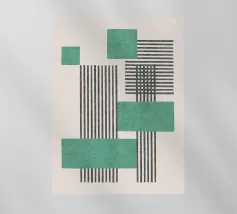 I motivi geometrici dominano l'immagine, con linee nere verticali su sfondo bianco. Varie forme, tra cui triangoli e rettangoli, si alternano per creare un senso di equilibrio e simmetria.
