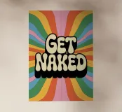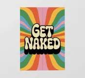 "Get Naked" in grassetto a caratteri retrò su uno sfondo arcobaleno psichedelico. Stile clipart vettoriale in stile poster anni '60 con colori vivaci e un design giocoso e accattivante.