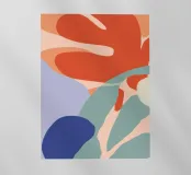 Una composizione astratta ispirata a Maraoui, con forme semplici e ritagliate in colori primari come il rosso, il blu e l'arancione su un morbido sfondo color lavanda. L'opera d'arte è al tempo stesso giocosa e sofisticata.