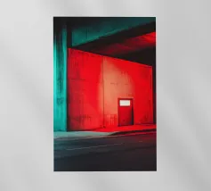 La calda luce del sole filtra da una finestra, proiettando ombre intricate su una parete vivace dipinta in arancione e blu-verde. I colori e le ombre contrastanti creano un'atmosfera serena.