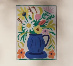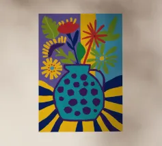 Un allegro ed espressivo bouquet di fiori gialli in un vaso blu brillante con due grandi manici. Lo sfondo giallo solare esalta la sensazione di gioia pura, semplice e senza fronzoli.
