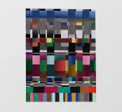 An abstract composition features a series of geometric shapes and bold, vibrant colors arranged in a grid pattern. Distinctive blocks of color are interspersed with linear elements, creating a visually dynamic and modern design.