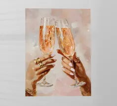 Elegante motivo champagne dal fascino retrò: tre mani che tintinnano su uno sfondo rosa celebrano la vita con bicchieri scintillanti. Questo poster conferisce un'atmosfera festosa a qualsiasi cucina, bar o parete del soggiorno. Perfetto per amiche, buongustai e appassionati di design con un debole per l'eleganza delle bollicine. Stampa artistica di alta qualità per la vostra parete - Salute!