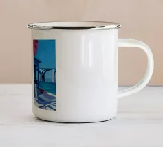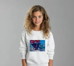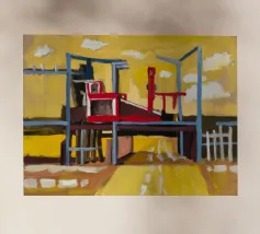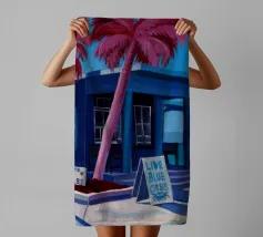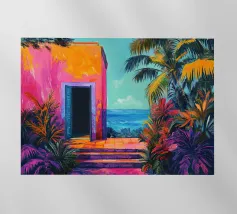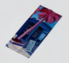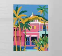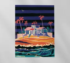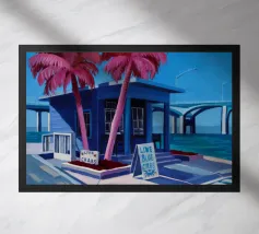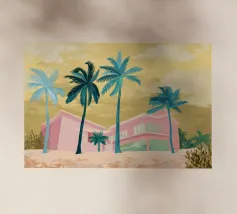 Un dipinto di un edificio modernista con un caratteristico tetto angolato, probabilmente in un luogo come Palm Springs, caratterizzato da linee pulite, palme e una fresca luce blu.