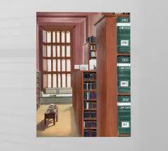 Un dipinto di un edificio modernista con un caratteristico tetto angolato, probabilmente in un luogo come Palm Springs, caratterizzato da linee pulite, palme e una fresca luce blu.