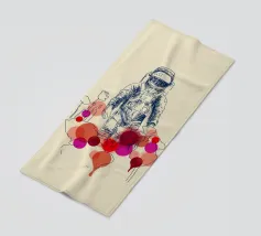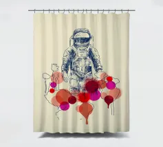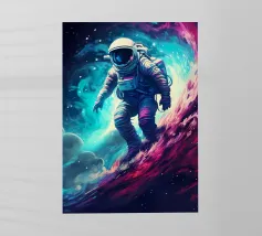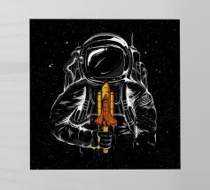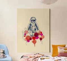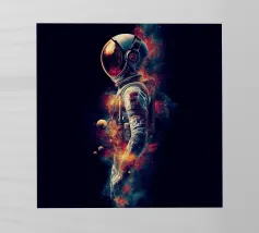 Un astronauta disegnato a mano, delineato da linee di schizzo blu, si staglia su uno sfondo chiaro. La sua presenza è surreale, circondata da cerchi astratti e colorati e da forme simili a palloncini nelle tonalità del rosso, del magenta e dell'arancione che sembrano fiorire o gocciolare intorno a lui. La miscela di esplorazione scientifica e forme stravaganti crea una sensazione di isolamento mista a meraviglia, come se si camminasse su un altro pianeta con l'immaginazione di un bambino.