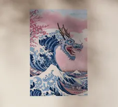 L'immagine raffigura un'illustrazione stilizzata in bianco e nero della Grande Onda al largo di Kanagawa, una famosa xilografia giapponese, con la Torre Eiffel sovrapposta all'onda. L'onda è raffigurata in un movimento dinamico e vorticoso, con creste spumeggianti e una base blu intenso. La Torre Eiffel si erge alta e slanciata, con la sua struttura intricata che contrasta con la forma organica dell'onda.