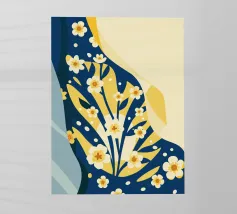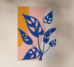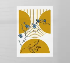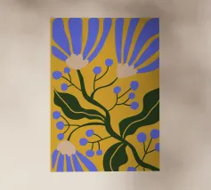 Un ramo stilizzato con foglie e bacche si staglia su uno sfondo astratto di forme blu, verdi e gialle. Le forme fluide e le morbide sfumature di colore danno un senso di armonia e di calma.