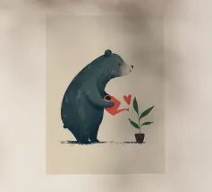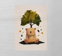 In a whimsical garden, a bear holds a juicy watermelon surrounded by fruits and a lush tree. The lively composition celebrates abundance and nature�s sweetness.