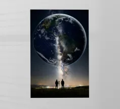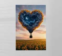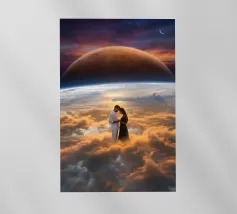 Un cuore colossale e consumato dalle intemperie fluttua serenamente sopra un vasto paesaggio incrinato, simbolo potente di un amore duraturo in un mondo desolato. Due piccole figure si ergono al suo cospetto, aggiungendo la scala epica e l'atmosfera cinematografica di questa opera d'arte surreale. Con i suoi toni vintage e le sue immagini che fanno riflettere, quest'opera è un invito alla conversazione e un tributo al grande viaggio dell'amore.