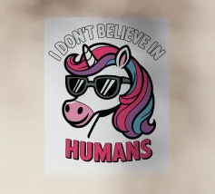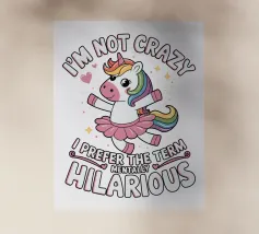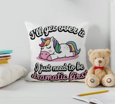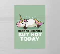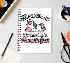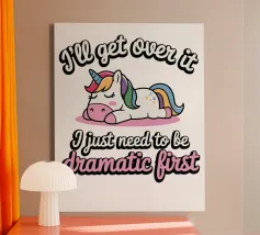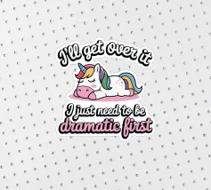 Un simpatico unicorno è sdraiato con una criniera colorata e appare rilassato e soddisfatto. Sopra e sotto l'unicorno, il testo recita umoristicamente: "Mi passerà, devo solo essere drammatico prima".