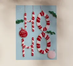 Due bastoncini di zucchero incrociati e ornati con agrifoglio e campanellino. Le parole "I'm hooked on you!" sono scritte sopra in una tipografia giocosa e festosa.