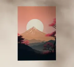 Una vista mozzafiato del maestoso Monte Fuji che si staglia nel cielo limpido di primavera. In primo piano, delicati fiori di ciliegio (sakura) danzano nel vento, conferendo alla scena una poetica leggerezza. La combinazione tra la forza della natura e la bellezza dei fiori simboleggia la transitorietà, l'armonia e il profondo legame tra la cultura giapponese e la natura. Questa immagine cattura perfettamente la magia della stagione della fioritura dei ciliegi, ideale per opere d'arte da parete, calendari o diari di viaggio.