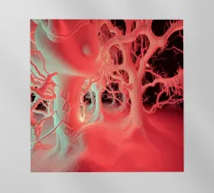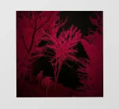 In una foresta surreale, alberi lussureggianti e piante uniche irradiano tonalità di rosso acceso nello spettro degli infrarossi su uno sfondo scuro, creando un'atmosfera ultraterrena.