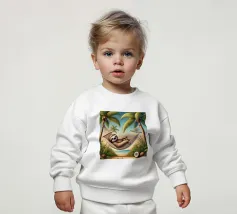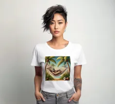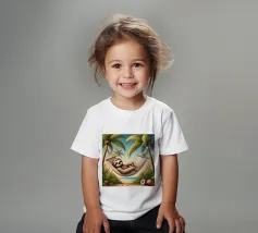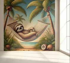 Illustrazione dettagliata in stile cartoon di un bradipo che dorme pacificamente su un'amaca sospesa tra due palme lussureggianti. Circondato da noci di cocco dorate e immerso nelle morbide sfumature di un tramonto tropicale, la scena emana tranquillità e calore. Il sorriso sereno del bradipo e le ombre giocose delle foglie di palma completano questa idilliaca fuga tropicale.
