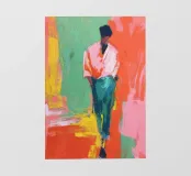Quadro astratto a pastello di un uomo in camicia e pantaloni blu che attraversa una stanza in rosa, verde e arancione. Forme minimaliste, aree piatte di colore, realizzazione moderna, giocosa e artistica. Atmosfera onirica e colorata.