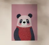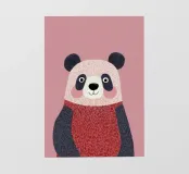 Un simpatico panda indossa un maglione rosso, ha occhi grandi, una pelliccia soffice e un corpo rotondo. L'illustrazione del libro per bambini presenta colori piatti, linee semplici, uno sfondo rosa e un'atmosfera allegra e affascinante in alta risoluzione.