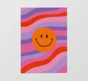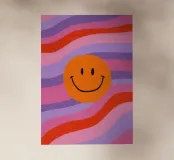 Illustrazione 2D piatta di una faccina sorridente retrò su uno sfondo ondulato con strisce rosa, arancioni, viola, rosse e blu. Estetica da poster vintage con texture granulosa ed effetto stampa risograph, stile anni '70, forme minimaliste e composizione audace e colorata.