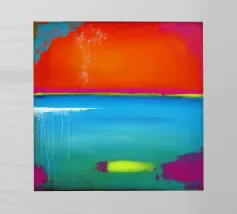 I toni astratti del blu e del turchese mirano a creare un'atmosfera rilassata e tranquilla. Guardando il mio quadro in cui l'acqua, il sole e l'orizzonte si fondono, l'immagine crea una sensazione di apertura e vastità.