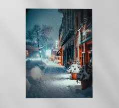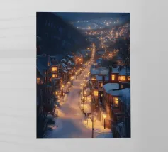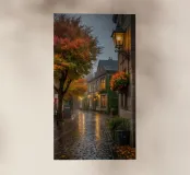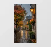 Una strada pittoresca è fiancheggiata da vivaci alberi autunnali e da edifici accoglienti, illuminati dalla luce soffusa delle lanterne in una serata piovosa, creando un'atmosfera serena.