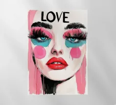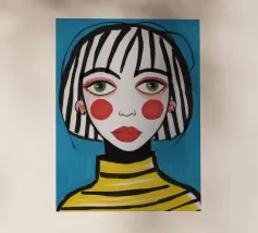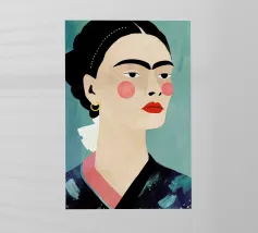 Un ritratto grafico di grande impatto di una donna con un'acconciatura nera e labbra rosse, con lo sguardo intenso rivolto all'osservatore, su uno sfondo colorato e astratto.