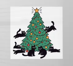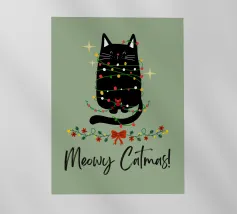 Un gatto nero che indossa un cappello da Babbo Natale è spiritosamente impigliato in luci natalizie colorate. Il testo accanto al gatto recita: "È abbastanza allegro?".