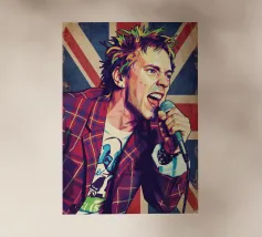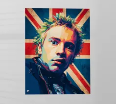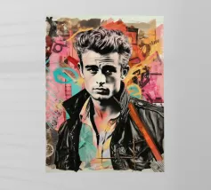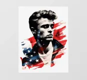 Un ritratto come un manifesto: i tratti ricordano James Dean - simbolo di ribellione giovanile, forza vulnerabile e sogno americano al tramonto. La sovrapposizione di stelle e strisce trasforma l'immagine in una riflessione su identità, libertà e proiezione. Stilisticamente a metà tra pop art, manifesto cinematografico e pathos patriottico, l'opera sembra un'eco dell'epoca in cui la freddezza e la malinconia divennero l'atteggiamento di un'intera generazione. Ideale per ambienti che intendono mostrare le icone come specchio della società.