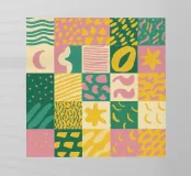A cheerful and colorful pattern composed of a grid of squares, each filled with different playful, geometric, and organic designs. The artwork has the warm, joyful feel of a modern, handcrafted quilt.