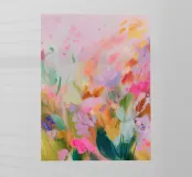 Il motivo mostra una composizione floreale dinamica e astratta, dai colori pastello decisi ma delicati. Pennellate di rosa, arancione e verde formano una moderna interpretazione di un prato fiorito estivo. La pittura conferisce all'opera profondità, leggerezza e un'aura naturale e vivace.