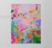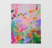 Il motivo mostra una composizione floreale dinamica e astratta, dai colori pastello decisi ma delicati. Pennellate di rosa, arancione e verde formano una moderna interpretazione di un prato fiorito estivo. La pittura conferisce all'opera profondità, leggerezza e un'aura naturale e vivace.