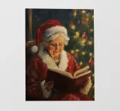 Questa bella immagine mostra la signora Babbo Natale con un cappotto rosso con orlo di pelliccia bianca e cappello, che legge comodamente un libro. Sullo sfondo brilla un albero di Natale addobbato a festa con luci scintillanti e decorazioni. Un motivo d'atmosfera che irradia calore, intimità e contemplazione natalizia. Ideale per poster, opere d'arte da parete, biglietti d'auguri o oggetti decorativi per portare l'atmosfera festiva in casa.