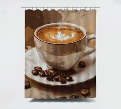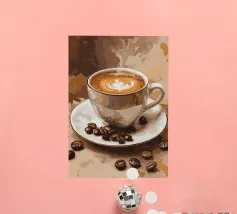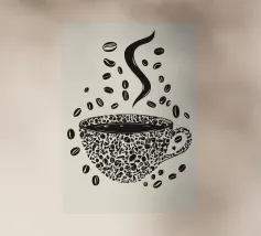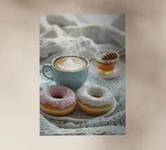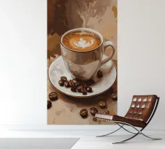 Un cappuccino preparato ad arte con latte art a forma di cuore è al centro di questa calda opera d'arte. La tazza fumante e i chicchi sparsi tutt'intorno creano un'atmosfera accogliente e quasi sensuale. Ideale per chi non si limita a bere il caffè, ma lo celebra. Perfetto per i bar, i baristi o come complemento di stile per la cucina.