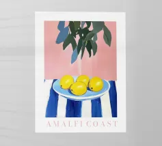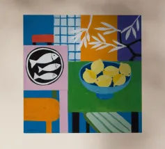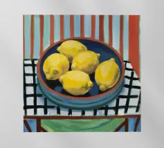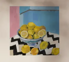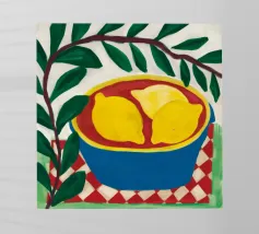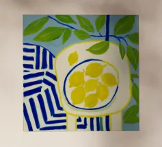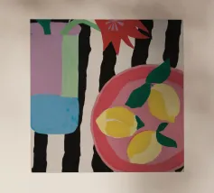 Una moderna natura morta di tre limoni in una scatola, su uno sfondo di foglie verdi e motivi grafici in bianco e nero. La composizione è un mix sorprendente di forme naturali e design grafico.