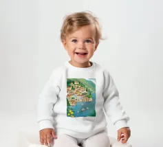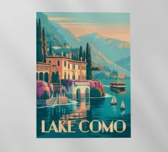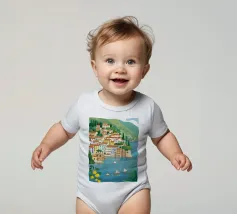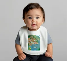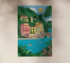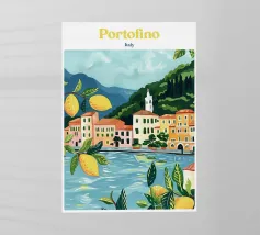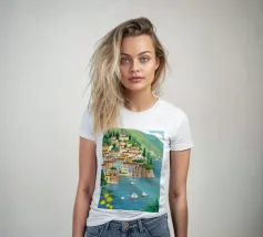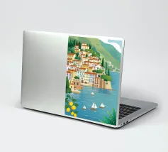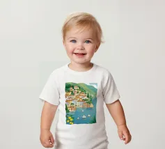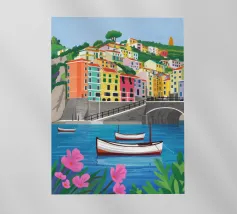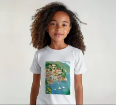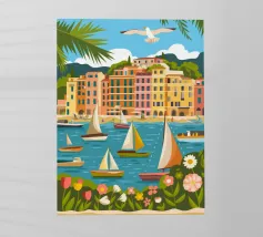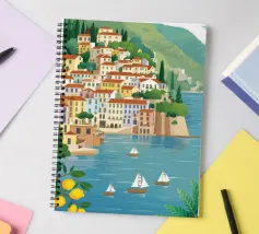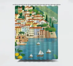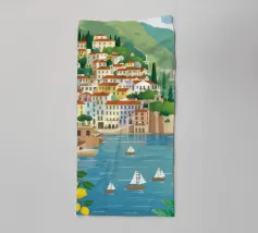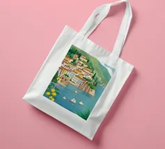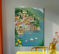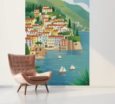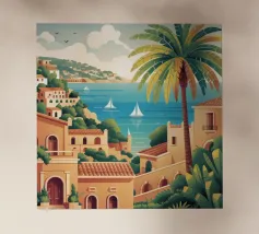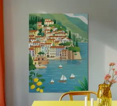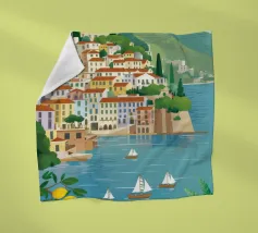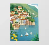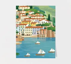 Illustrazione panoramica di una classica città costiera italiana adagiata in una baia, con alberi di limone in primo piano, case bianche sulle scogliere e barche a vela sull'acqua.
