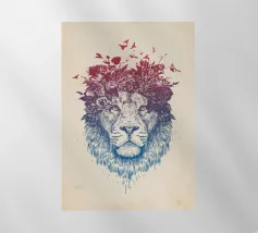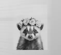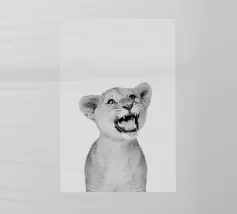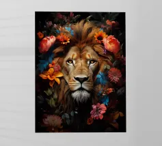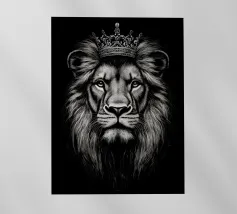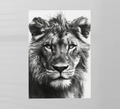 Il ritratto di un leone mostra grandi occhi espressivi e una corona floreale in bianco e nero. La morbida pelliccia è perfettamente enfatizzata in un'illustrazione fotografica minimalista e cattura lo straordinario fascino della natura. Ideale per gli amanti degli animali.