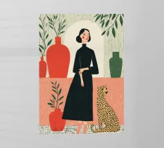 This artwork captures a person in a black dress striking a poised pose beside a leopard. The scene exudes sophistication, confidence, and timeless artistry.