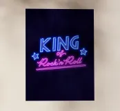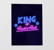Una bella scritta a mano che sembra un'insegna al neon. Re del Rock'n Roll. Per tutti coloro che amano il rock'n roll e questo stile di vita, questa attitudine alla vita. Un grande motivo di hand lettering in colori vivaci come il blu e il rosa.